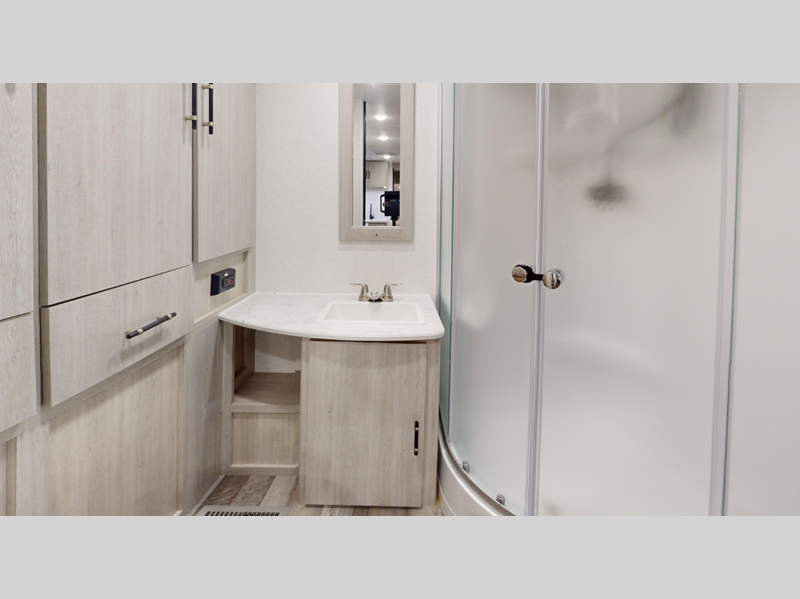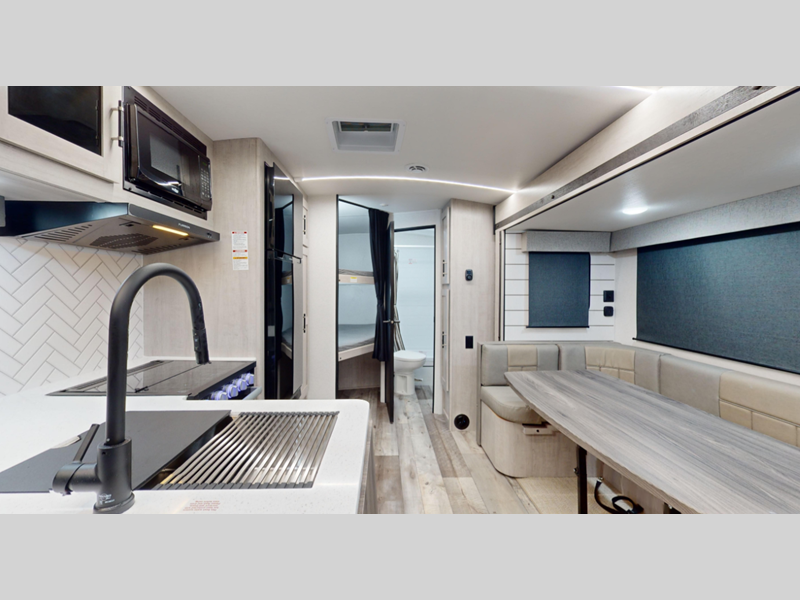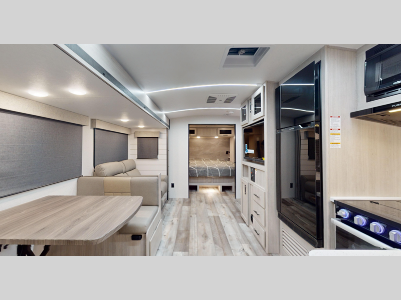 Each model features an enclosed and heated underbelly for added protection plus a one-piece seamless super flex roof for added strength. There are also magnetic slam latch doors outside, along with solar power prep, backup camera prep, and a power awning with LED lights. Inside, you'll enjoy the hardwood cabinet doors, solid surface kitchen countertops, a decorative bedspread and many more comforts.