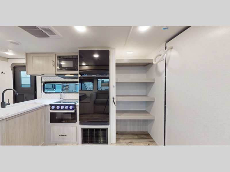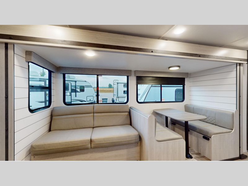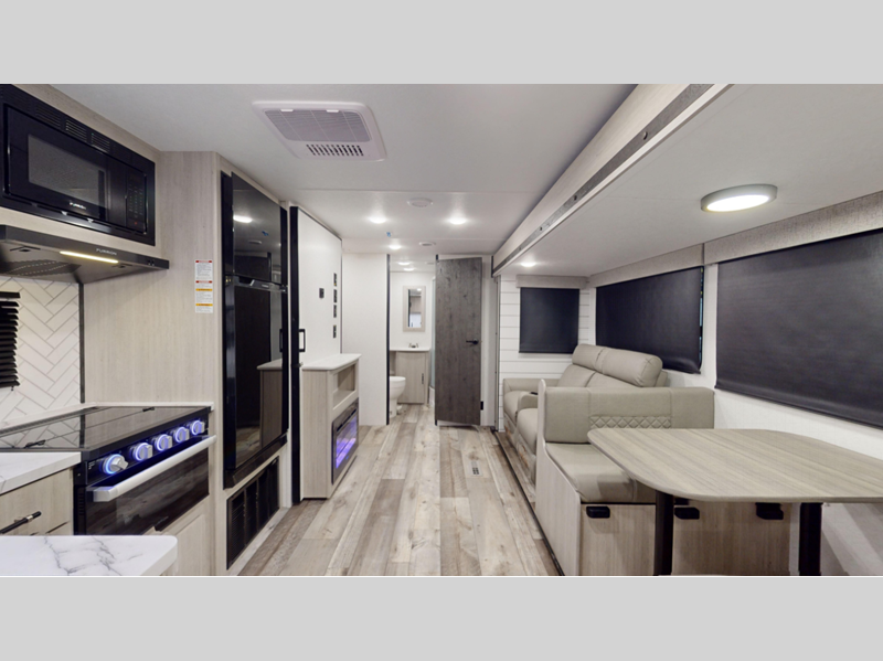 Sleeps 4 Slides 2 Length 30 ft 11 in Ext Width 8 ft Ext Height 11 ft 1 in Interior Color Breezy Beige, Granite Gray Hitch Weight 874 lbs Dry Weight 5980 lbs Cargo Capacity 1620 lbs Fresh Water Capacity 43 gals Grey Water Capacity 60 gals Black Water Capacity 30 gals Furnace BTU 30000 btu Available Beds King Refrigerator Size 10 cu ft Cooktop Burners 3 Number of Awnings 1 LP Tank Capacity 20 lbs Water Heater Type On Demand Gas AC BTU 13500 btu Awning Info Power with LED Lights Axle Count 2 Number of LP Tanks 2 Shower Type Radius Electrical Service 30 amp Similar Floorplans