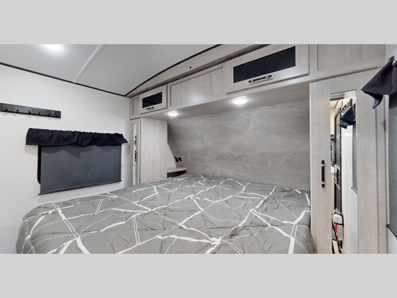 Sleeps 2 Slides 1 Length 26 ft 11 in Ext Width 8 ft Ext Height 11 ft 1 in Interior Color Breezy Beige, Granite Gray Hitch Weight 658 lbs Dry Weight 5298 lbs Cargo Capacity 2302 lbs Fresh Water Capacity 45 gals Grey Water Capacity 30 gals Black Water Capacity 30 gals Furnace BTU 30000 btu Available Beds King Refrigerator Size 10 cu ft Cooktop Burners 3 Number of Awnings 1 LP Tank Capacity 20 lbs Water Heater Type On Demand Gas AC BTU 13500 btu Awning Info Power with LED Lights Axle Count 2 Number of LP Tanks 2 Shower Type Radius Electrical Service 30 amp Similar Floorplans